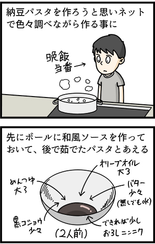 納豆パスタ 2014年11月07日 納豆パスタって意外においしいですね。 納豆は別のボールに刻んだネギと醤油、辛子と一緒に混ぜておいてから、お皿の上で盛ってます。 最後に刻んだノリと大葉を載せて完成。ほんの少しだけ、風味付け程度におろしニンニクを混ぜる事ができると一層おいしいです。 今度は違 ... 続きを読む