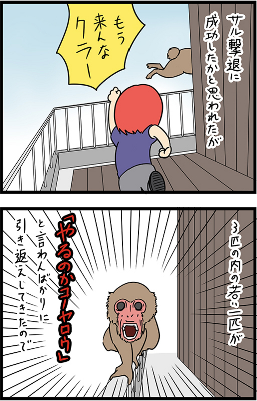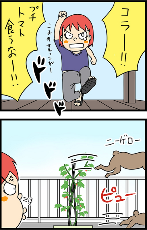 トマト攻防戦 2015年01月30日 向ってきたサルは、随分喧嘩っぱやいやつで、追いかけたらすぐに向かってきました。 ひょっとすると若頭だったのかもしれません。 サルは武器の威力が分かるみたいで、ほうきを持ったら明らかにひるんでいました。 万が一サルが出たら長い棒を持つといいようです。 本来な ... 続きを読む