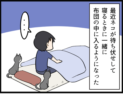 毎晩布団に入るネコに思う事 2019年12月25日 最初の頃は布団に入れてほしい時に、まくらをポンポン叩いてお願いしてきたものでしたが、最近は隙間があるとヒュッと勝手に入ってきて、かなり強引です。布団の中もそれぞれお気に入りの場所があるようで、カイは股の間や足元。ナルは腕の付近か枕元。すっかり布団の中に入 ... 続きを読む