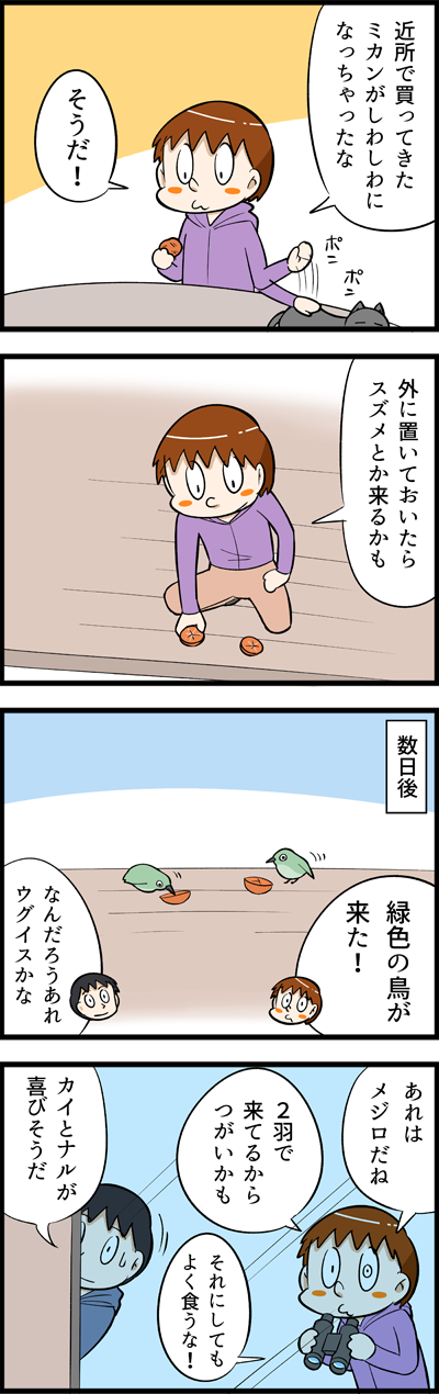 ミカン好きのお客さん 2022年02月19日 何年か前にもお米やパンくずを撒いてスズメやヒヨドリなどの鳥を観察していたことがあったんですが、今年はメジロがやってきました。今では台を置いてリンゴも置いてるんですが、最初は1匹のメジロが・・・しばらくしたらもう1匹連れてきて、いつもセットで現れるようになり ... 続きを読む