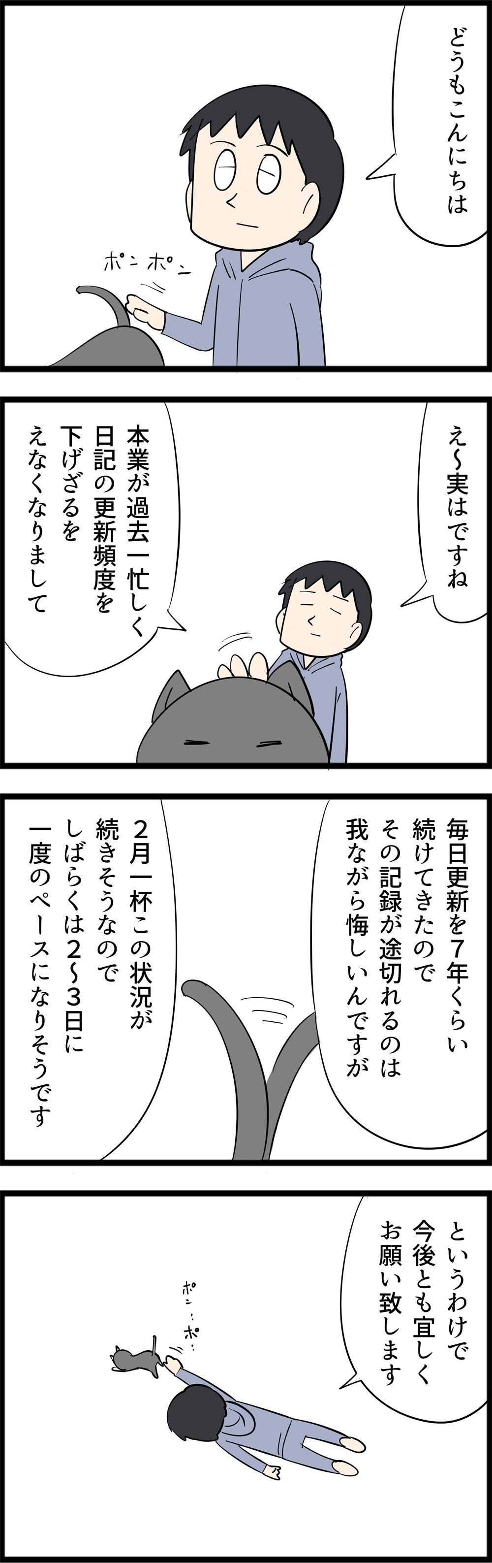 え~と実は・・・ 2025年02月04日 ちょっと今までにない波が来まして、さすがにもう無理だと思いました。日記のストックはあるんですけどね・・・しばらく不定期になるかと思うんですが、宜しくお願い致します~。時代劇のLINEスタンプを作りました。カイとナルのLINEスタンプを作りました。いつもブログランキングへのクリックありがとうございます!人気ブログランキングとても励みになっておりますので、よろしかったらポチっとお願いします! 「日々雑感」カテゴリの最新記事 < 前の記事次の記事 > コメント コメント一覧 (11) 11. ちゅら 2025年02月07日 08:01 本業がお忙しいのは何よりです! お体お大事になさってください〜 0 jyajyayome がしました 10. たいぎー 2025年02月05日 12:38 それは残念です。 ですが、どうかくれぐれもご自愛ください。無理してお身体を壊したら元も子もありませんし。 0 jyajyayome がしました 9. もし可能なら 2025年02月04日 19:28 猫の写真を時間ある時に下書きストック、漫画ない時は猫写真予約投稿だと嬉しいな 0 jyajyayome がしました 8. ゆうちん 2025年02月04日 18:29 寂しいなぁ〜 でも、本業が1番ですから仕方なし… 更新楽しみに待ってますね^ - ^ 0 jyajyayome がしました 7. 楽しみです 2025年02月04日 14:20 自己管理をしっかり!無理しすぎは禁物です。 ブログ楽しみにしています。 0 jyajyayome がしました 6. 素晴らしい 2025年02月04日 14:10 毎日更新が厳しくなる程の商売繁盛とはおめでたいです㊗️ 0 jyajyayome がしました 5. あんこ 2025年02月04日 12:53 無理しないでくださいね!ゆっくり気長にお待ちしてます(^ω^) 0 jyajyayome がしました 4. 田中 2025年02月04日 10:55 初めてコメントします。 同じ神奈川在住なので、勝手にシンパシーを感じつつ、愛読させて頂いております。 今後も可能な範囲で継続頂けると嬉しいです。 楽しみにしています。 0 jyajyayome がしました 3. めろ 2025年02月04日 09:17 コメントしたことないかも…?ですが、毎日楽しませてもらってます。 無理のない範囲での更新で大丈夫ですよ。さみしいときは過去記事読み返しますね。 お仕事頑張ってください! 0 jyajyayome がしました 2. ナオキ 2025年02月04日 08:28 不定期になってしまうのは少し残念ですが、本業が忙しい事は良い事だと思います。無理せず体調に気をつけて頑張って下さい。 0 jyajyayome がしました 1. 猫助 2025年02月04日 08:23 更新が、いつもの時間じゃなかったので心配しました。 楽しみにしてますので、頑張って下さい。 0 jyajyayome がしました コメントフォーム 名前 コメント 記事の評価 リセット リセット 顔 星 情報を記憶 コメントを投稿する